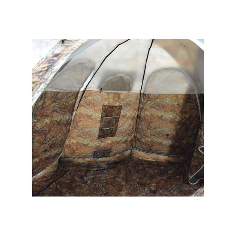 Просторный шатер УП-5 Люкс оснащен одним основным входом с возможностью установки распашной двери, четырьмя дополнительными арочными входами с антимоскитными сетками, молниями для пристегивания перегородки