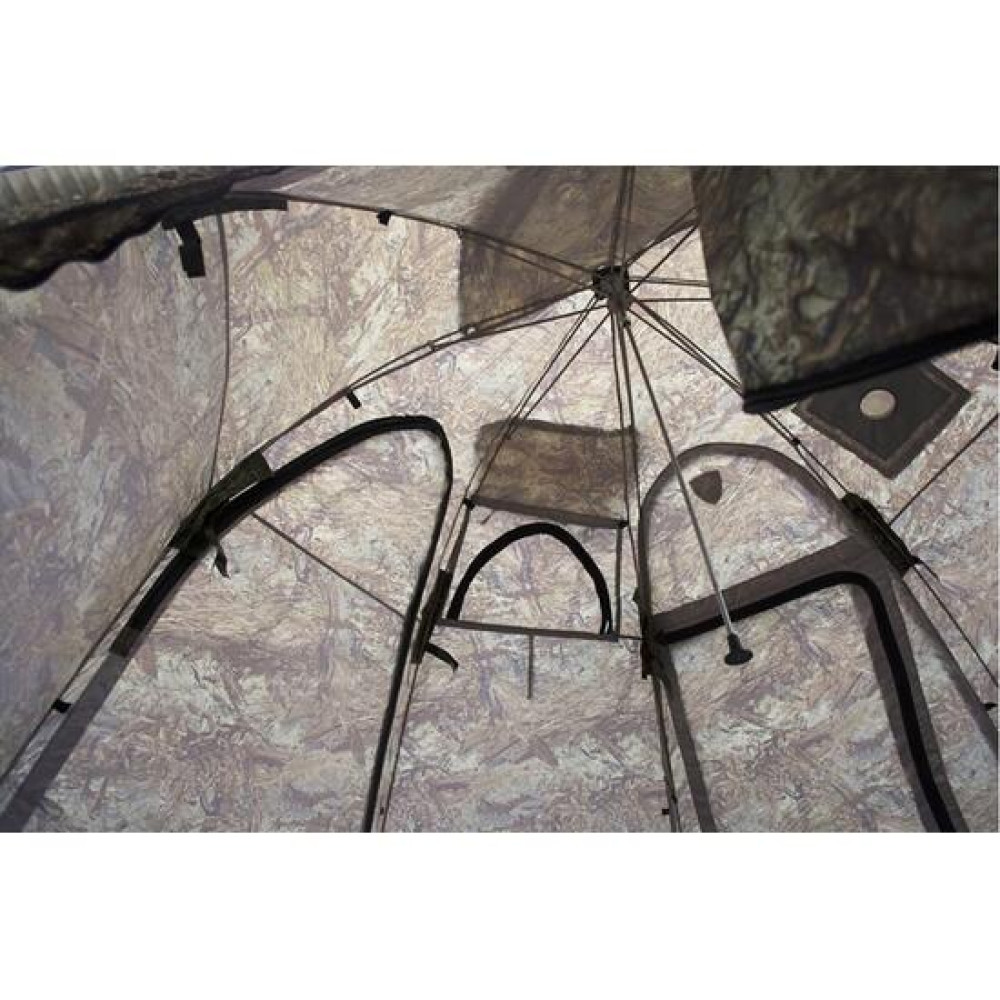 Палатка УП-4 оборудована двумя смотровыми окнами с антимоскитыми сетками на молнии и прозрачным заполнением из морозостойкой силиконовой пленки