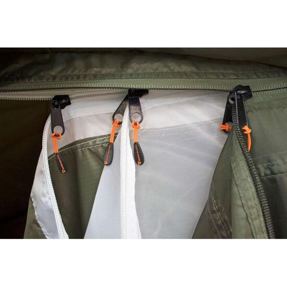 В нижней части палатки расположена защитная юбка с оттяжными петлями для установки кольев или ввертышей