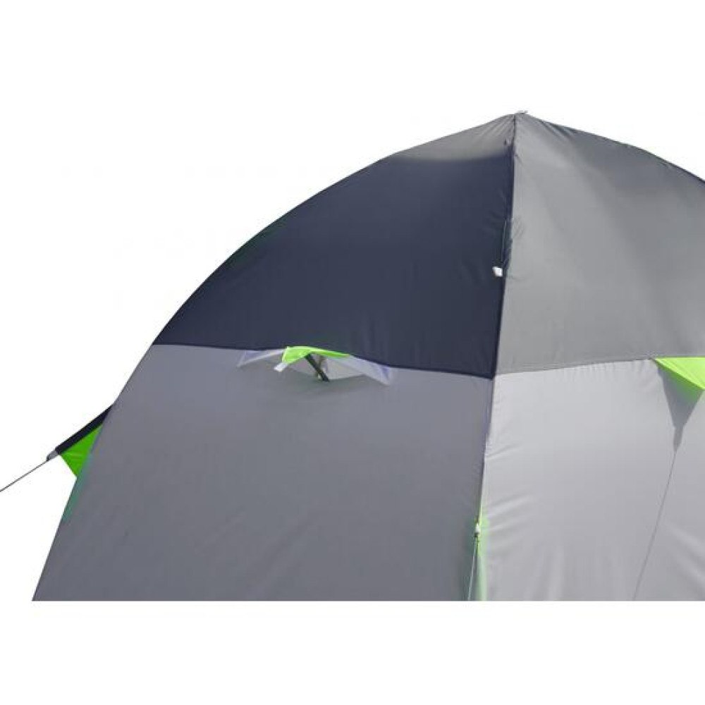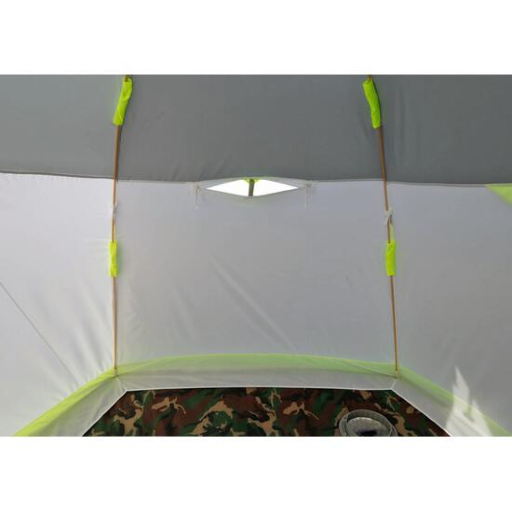 Палатка оснащена: Двумя цельными защитными юбками, внутренней (15 см) и внешней (20 см) с 10-ю креплениями для ввертышей;Девятью усиленными креплениями для растяжек: 5 креплений на дугах и 4 на стенках палатки;Вытяжным клапаном, встроенным в верхней молнии дверного замка;Смотровым окном на прочной молнии №10 с регулировочной планкой, расположенным на противоположной от входа стенке;Широкой двухстворчатой Т-образной дверью, оснащенной тремя замками, позволяющими открывать каждую створку по отдельности, а также раскрывать дверь во всю стенку палатки, образуя проход шириной 1,5 метра;Регулировочным ремнем на дугах дверного проема, который снимает нагрузку с вертикальной молнии двери и гарантирует ее легкое открывание;Большими карманами для вещей в нижней части и малыми карманами для мелких предметов в верхней части на внутренних стенках;Компрессионной сумкой увеличенной вместимости