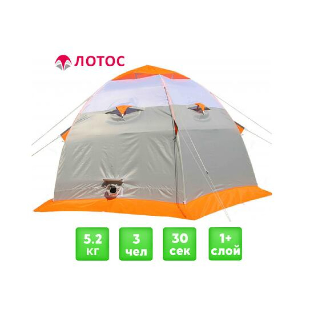 ЛОТОС 3С (оранжевый) Каркас Л3-С12 (стеклокомпозитный пруток 12 мм)Цвет тента бело-серо-оранжевыйАртикул: 17055Вес: 6,2 кг Все четыре модели палатки оснащены внешним тентом с функционально-одинаковой конструкцией