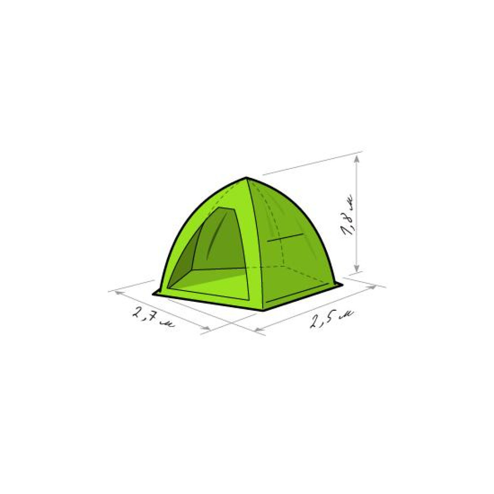 | Водостойкость тента3000 мм | Время сборки (сек)20 сек. | Габариты установленной палатки(Длина, ширина, высота)270х255х180 |