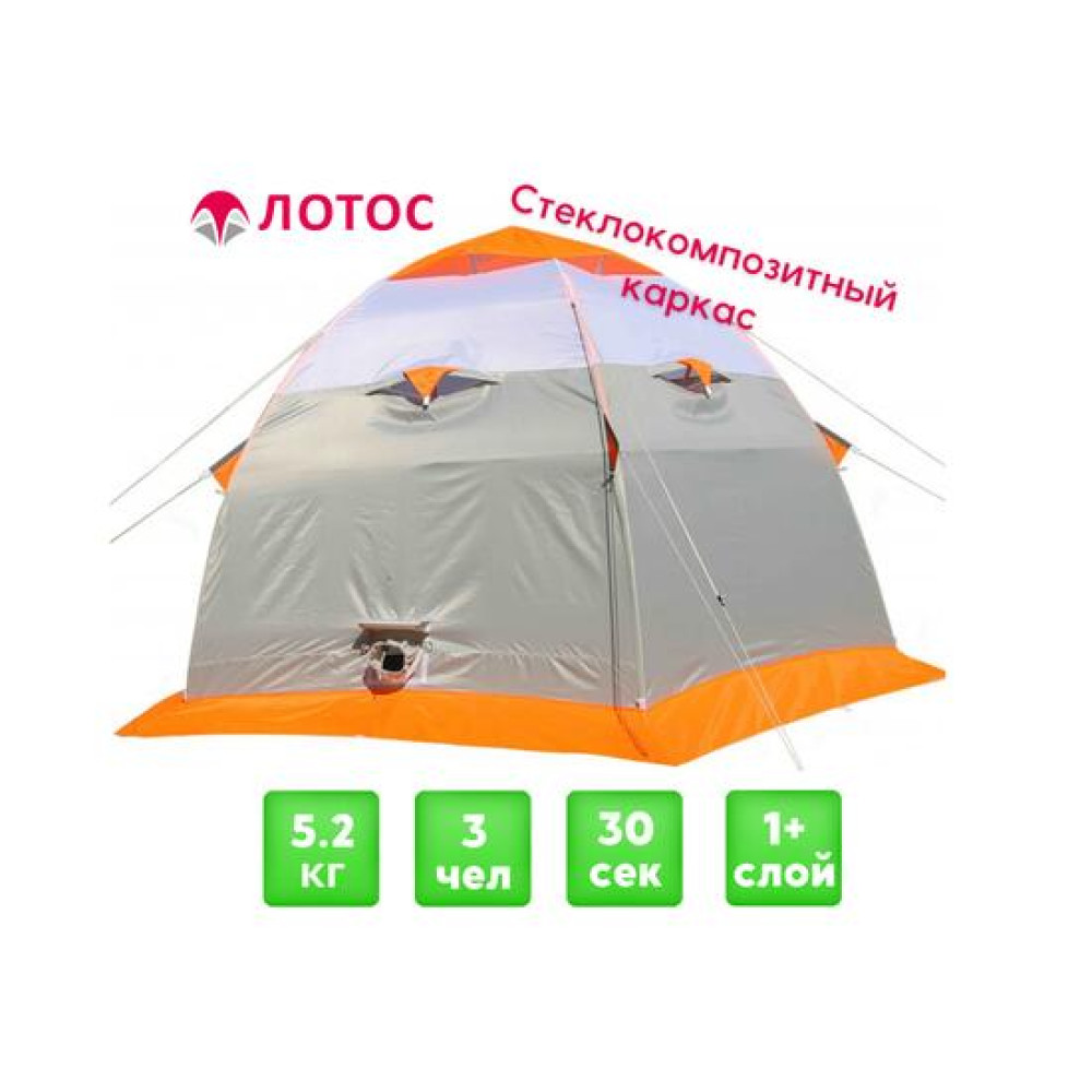 | Габариты установленной палатки(Длина, ширина, высота)270х255х180 ОписаниеХарактеристикиОтзывы Зимняя палатка ЛОТОС 3С на стеклокомпозитном каркасе Модель ЛОТОС 3С укомплектована усиленным стеклокомпозитным каркасом, не уступает по жесткости модели ЛОТОС 3, | оранжевый |