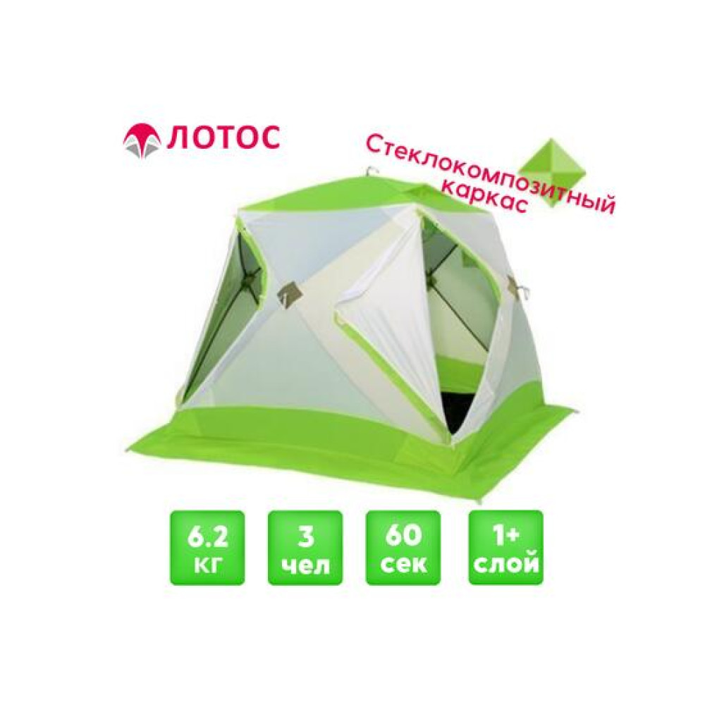 | Время сборки (сек)60 | Габариты установленной палатки(Длина, ширина, высота)210х210х180 | Габариты установленной палатки(Длина, ширина, высота)210х210х180 ОписаниеХарактеристикиОтзывы Зимняя палатка ЛОТОС Куб 3 Классик С9 на стеклокомпозитном каркасе ЛОТОС Куб 3 Классик - полуавтоматическая палатка куб для зимней рыбалки. ✔Палатка представлена салатовый |