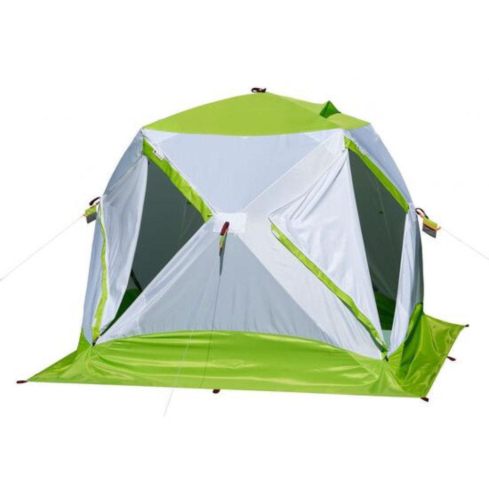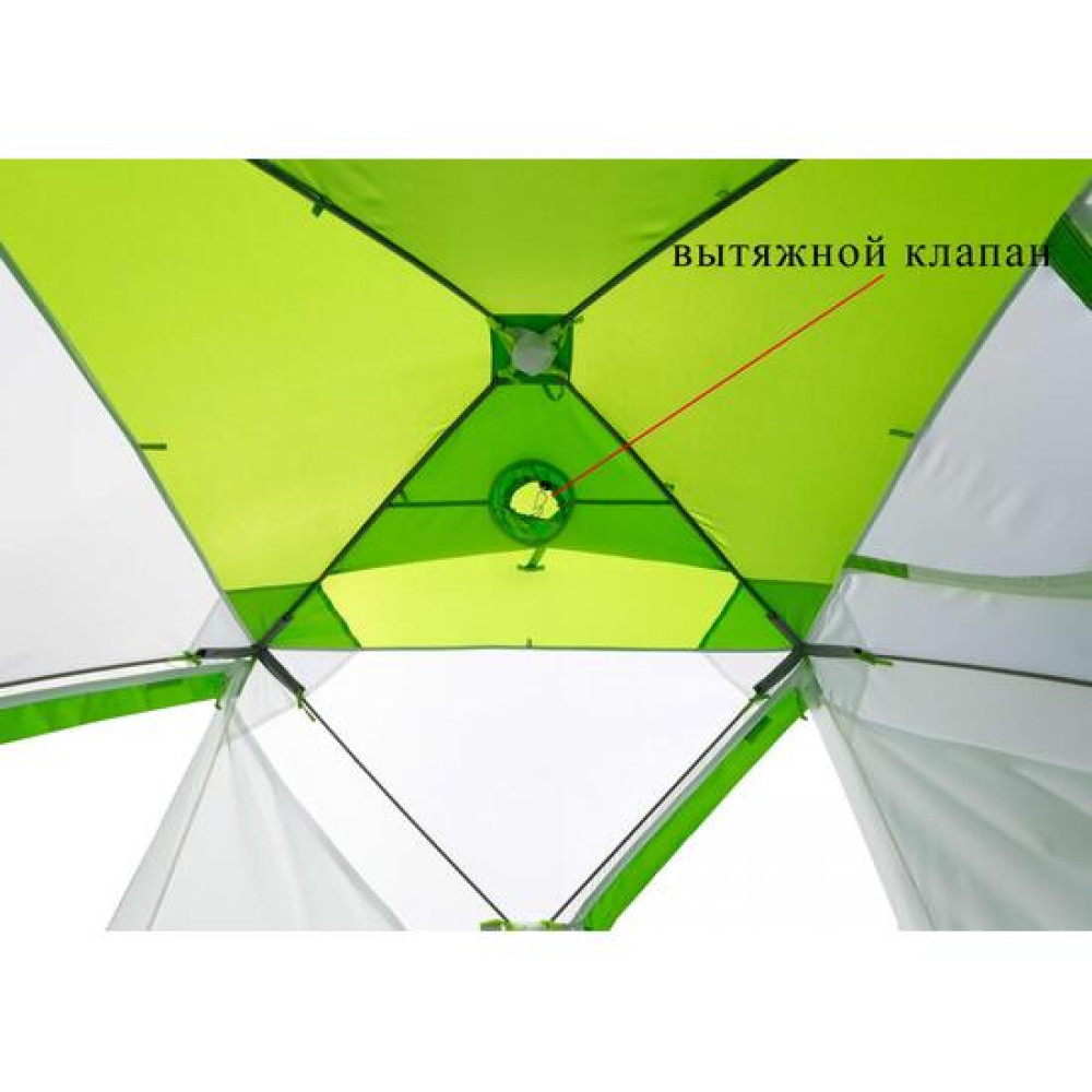 Дизайн палатки выполнен в бело-салатовом цветовом исполнении с использованием светопроводящих тканей