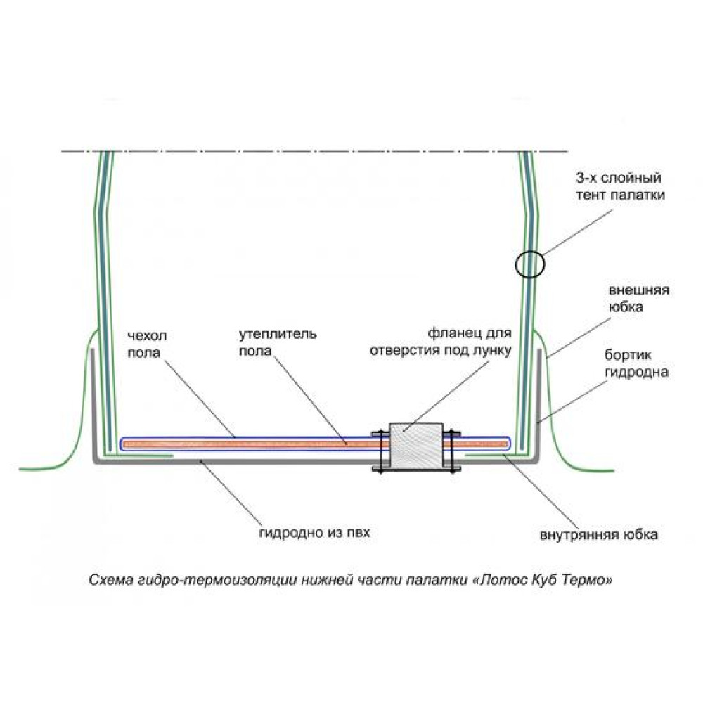 Палатка крепится к гидроизоляционному дну (опция, приобретается отдельно) при помощи петель, которые расположены под внешней юбкой, при этом сама юбка обеспечивает надежную защиту от попадания осадков внутрь «гидро-корыта»