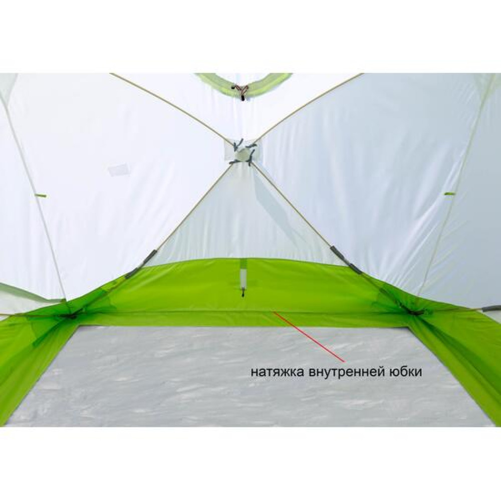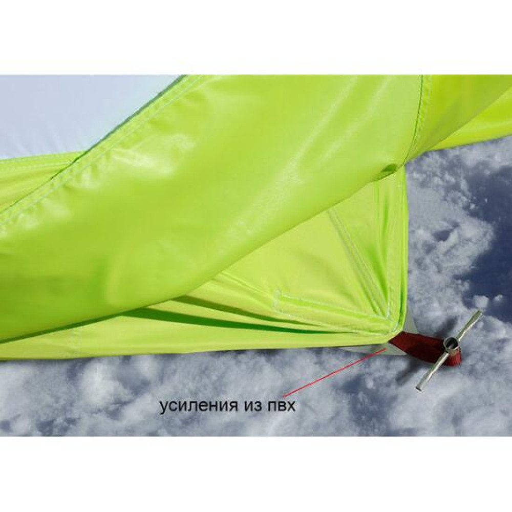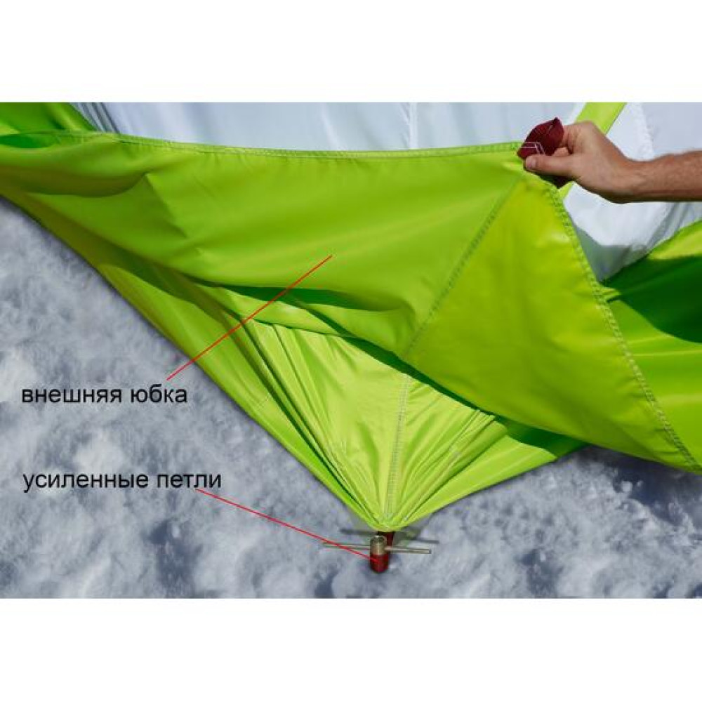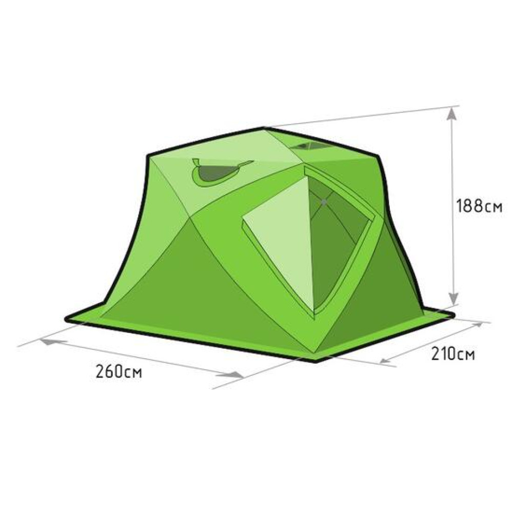 Высота палатки 188 см при ширине дна 260 х 210 см; Профессиональный комплект оснащения палатки для подледной рыбалки; Высокая свето-проводимость тента, выполненного в бело-салатовом цветовом исполнении; Влагозащитный тент дублирует все функциональные элементы палатки обеспечивая укрытию полную защиту от дождя (опция); Гидро-термоизоляционное дно с отверстиями под лунки обеспечивает надежную гидроизоляцию и термоизоляцию пола и нижнего периметра палатки, защищая поверхность пола от затекания воды через лунки (опция); Утепленный пол позволяет значительно повысить теплоизоляцию палатки во время подледного лова (опция); Съемное утепление - внутренний тент из высокотехнологичного нетканого материала с высокой теплоизоляцией и полным отсутствием конденсата (опция); Компрессионная сумка-рюкзак