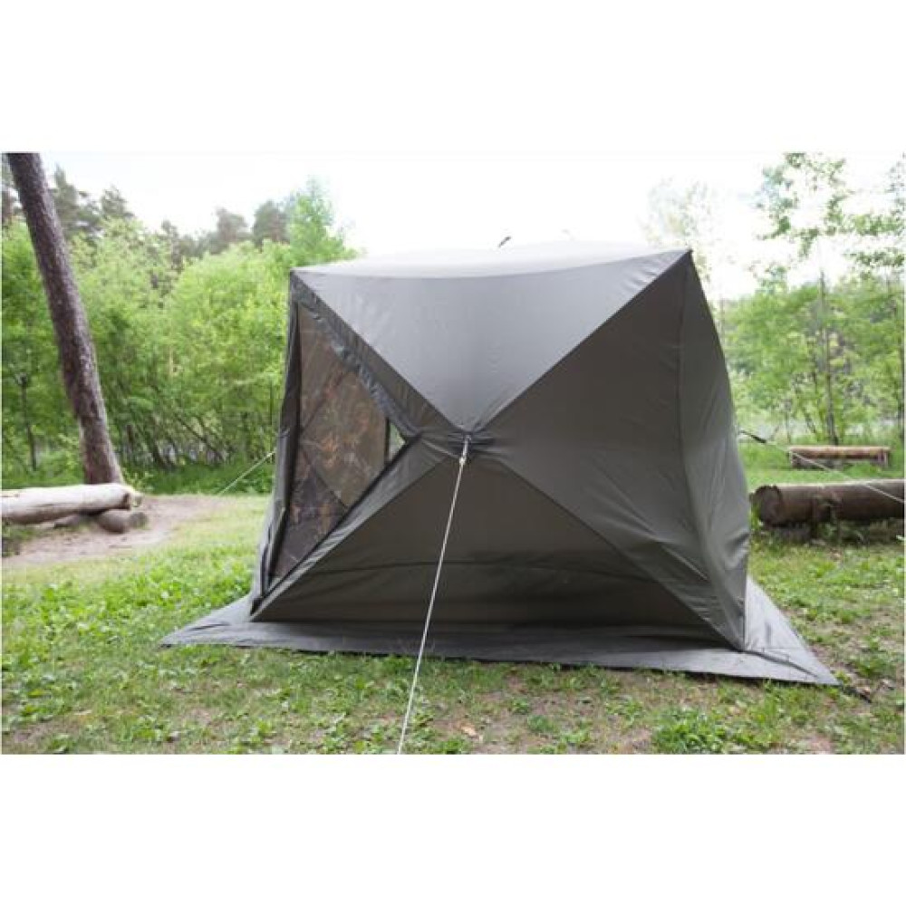 12 оттяжек для крепления палатки – 4 на хабах и 8 на юбке.Удобный фирменный чехол позволяет свободно уложить укрытие