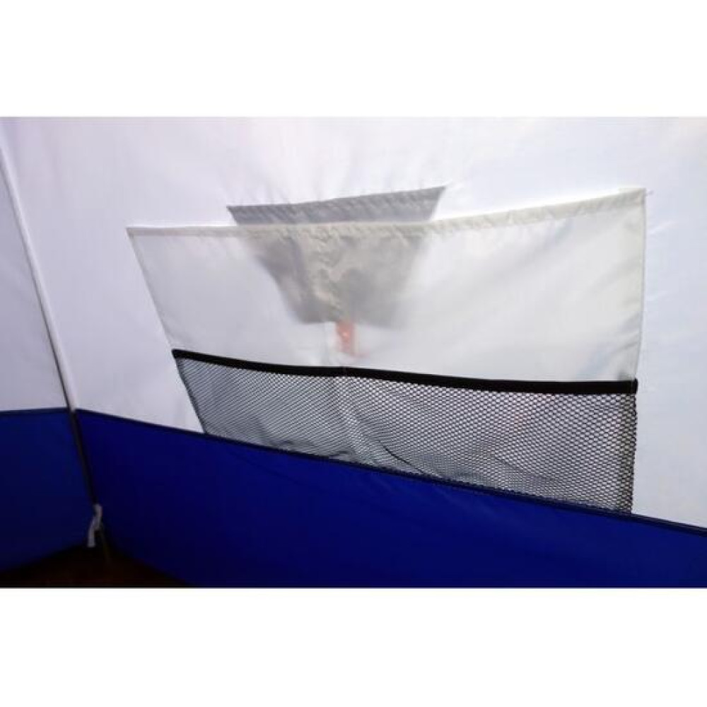 В тенте имеется форточка в виде молнии на крыше, два кармана в верхней части тента под снасти и два сдвоенных кармана с сеткой в нижней части тента