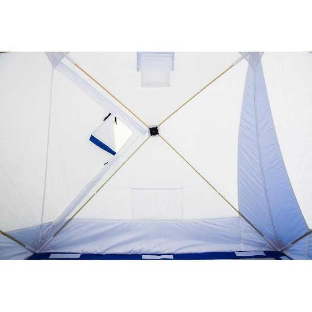на м2;- Надежный стеклокомпозитный каркас диаметром 10мм;- Удобная и надежная система крепления утепленного пола к палатке;- Продуманная система вентиляции;- Защита молний от продувания, за счет наличия внутренней утепленной планки;- Высокая свето-проводимость тента, за счет использования светлых материалов;- Наличие светоотражающей ленты и светоотражающего канта;- Возможность укомплектовать палатку трехслойным непромокаемым полом (дополнительная опция);- Удобный и надежный чехол для транспортировки палатки, имеющий молнию и ремни-утяжки, позволяющие компактно сжать упакованную палатку.Характеристики: Высота внутренняя боковая: 1,74 мВысота по центру: 1,95 мРазмер внутренний по полу: 2,3м х 2,3мРазмер в сложенном виде: 1,53м х 0,37м х 0,37мМасса с чехлом: 15 кгКоличество входов/выходов: 2Материал внутреннего/внешнего тента: Oxford 210D 1000PUМатериал утеплителя: Каландрированный синтепонПлотность утеплителя: 150 гр на м2Внутренние карманы: 6 штКоличество вентиляционных/смотровых окон: 4 штКоличество приточных клапанов: 2 штЗащитная планка на входной молнии: да (внутренняя+внешняя)Юбка наружняя: даЮбка внутренняя: даНаличие светоотражающей ленты и канта: даНаличие системы крепления палатки к полу: даМатериал каркаса: стеклокомпозитный пруток