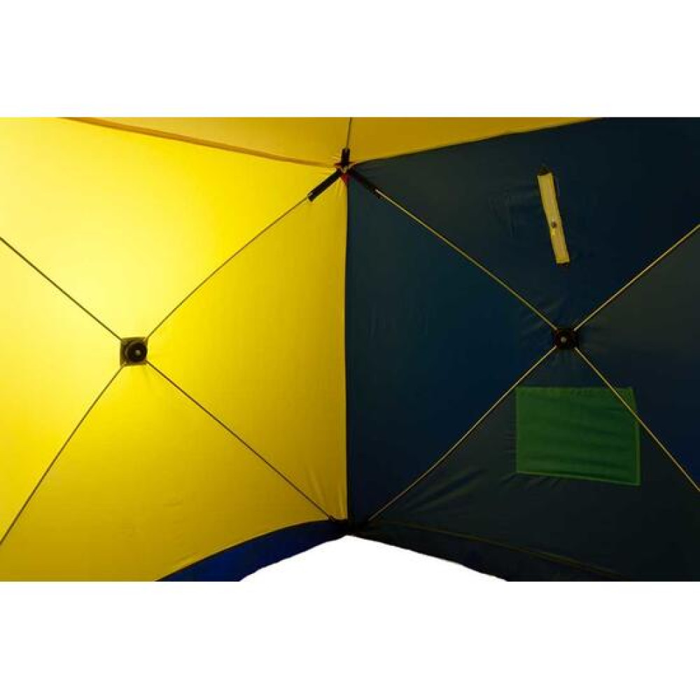 В собранном виде палатка имеет кубическую форму с выпуклыми наружу стенками, что способствует увеличению внутреннего объема и позволяет рыболовам стоять в полный рост