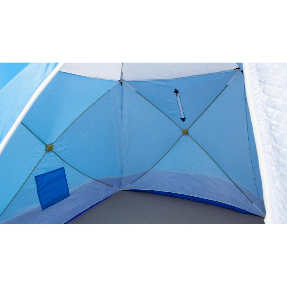В собранном виде палатка имеет кубическую форму с выпуклыми наружу стенками, что способствует увеличению внутреннего объема и позволяет рыболовам стоять в полный рост