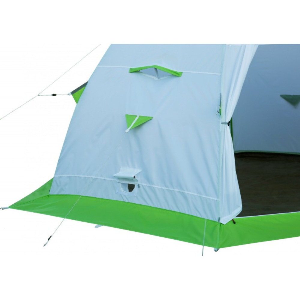 На расстоянии 80 мм от пола предусмотрена молния для пристёгивания влагостойкого пола. В результате получается просторная «чаша», которая препятствует попаданию воды внутрь помещения. Это качество по достоинству оценят рыбаки, когда лёд начнёт подтаивать.