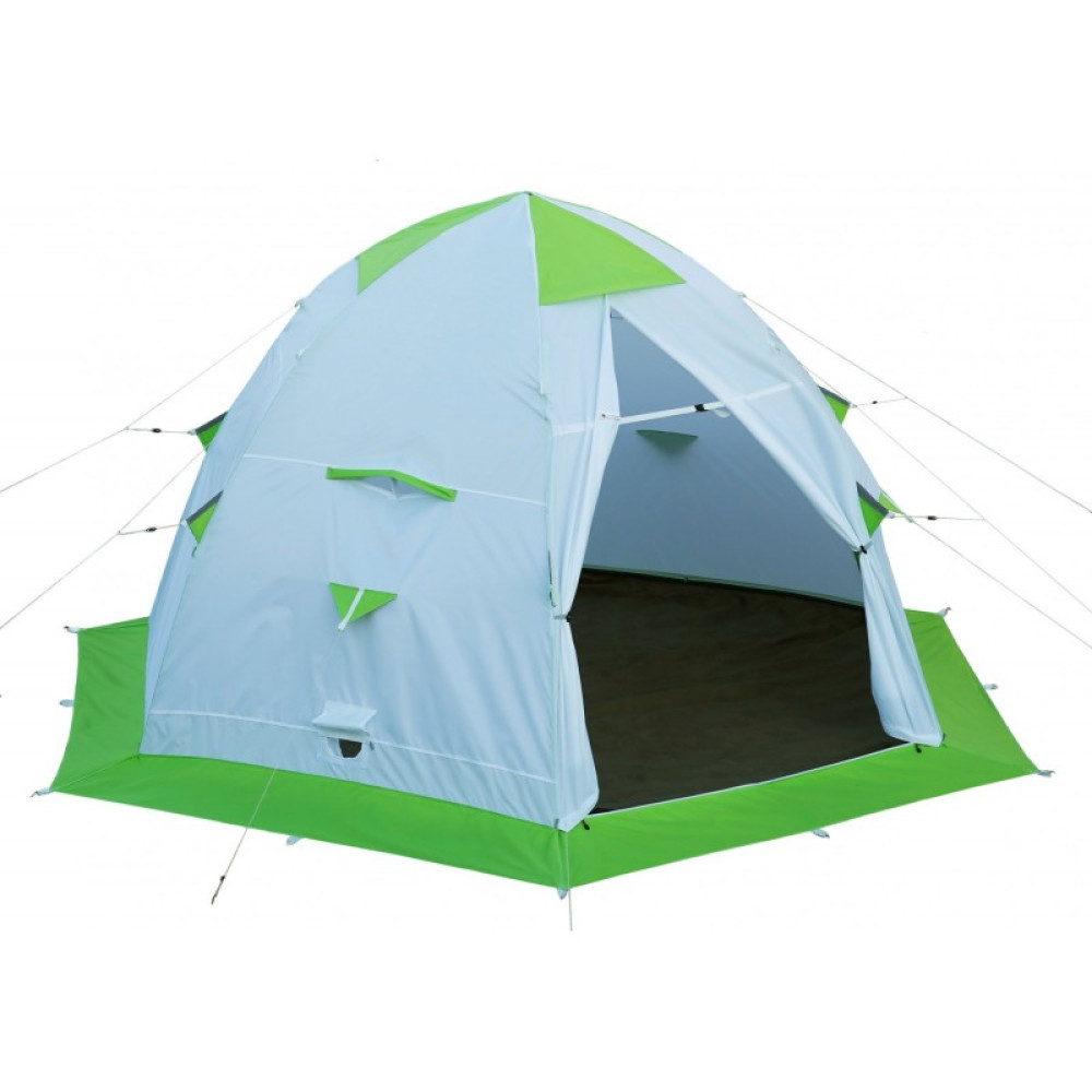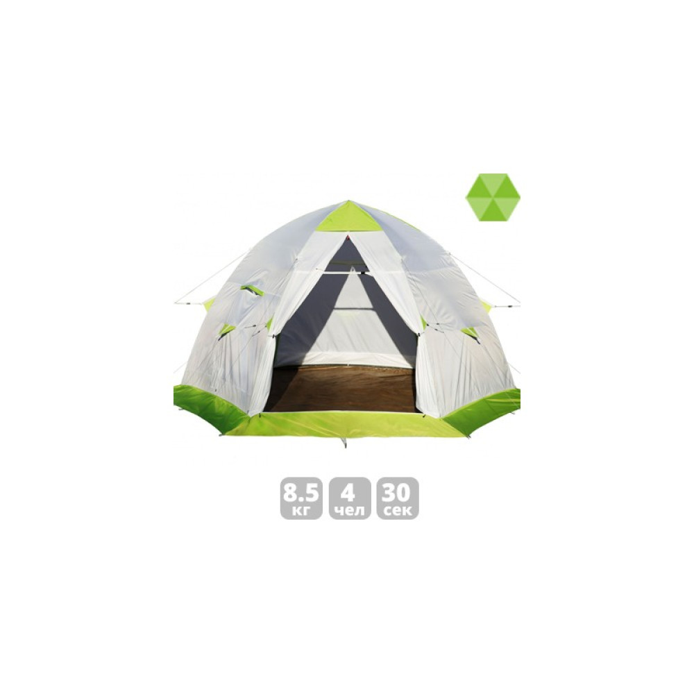 - Основой конструкции палатки теперь является шестигранный каркас, образующий купол. Большой размер не является помехой для эксплуатации её при любой погоде. Для надёжной фиксации на льду она оборудована рядом усиленных креплений. Даже ветра со скоростью 100 км/час не способны стронуть её с места.