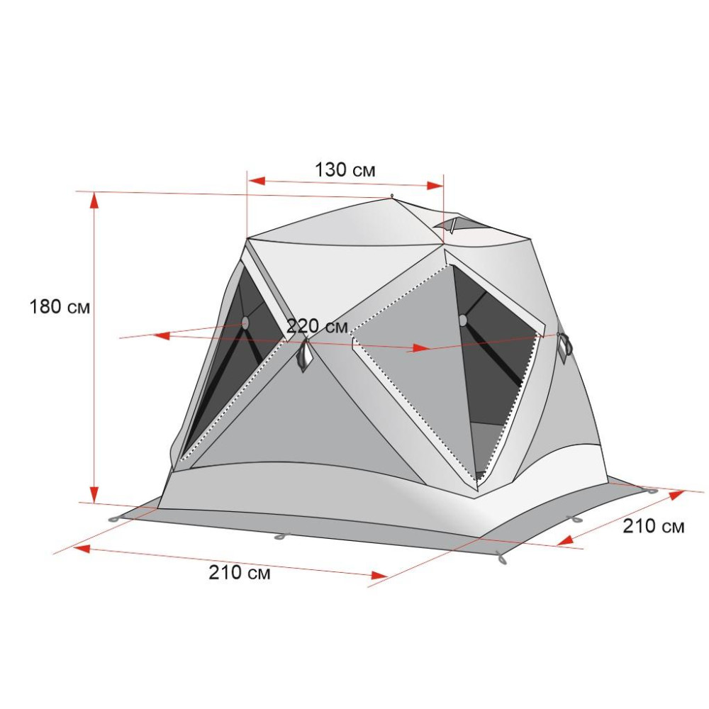 - Каркас с дугами из высокопрочного алюминиевого сплава В95Т1 диаметром 9 мм. Стенки каркаса расположены под наклоном к центру образуя форму палатки в виде призмы, что повышает жесткость и ветроустойчивость укрытия. Наклон стенок снижает внутренний объем нерационального жилого пространства в верхней его части, что повышает показатель тепло-сбережения укрытия, при сохранении его полезной площади. Высота палатки составляет 180 см при размере дна 210 х 210 см и в сложенном виде в сумке имеет размер по длине 145 см.