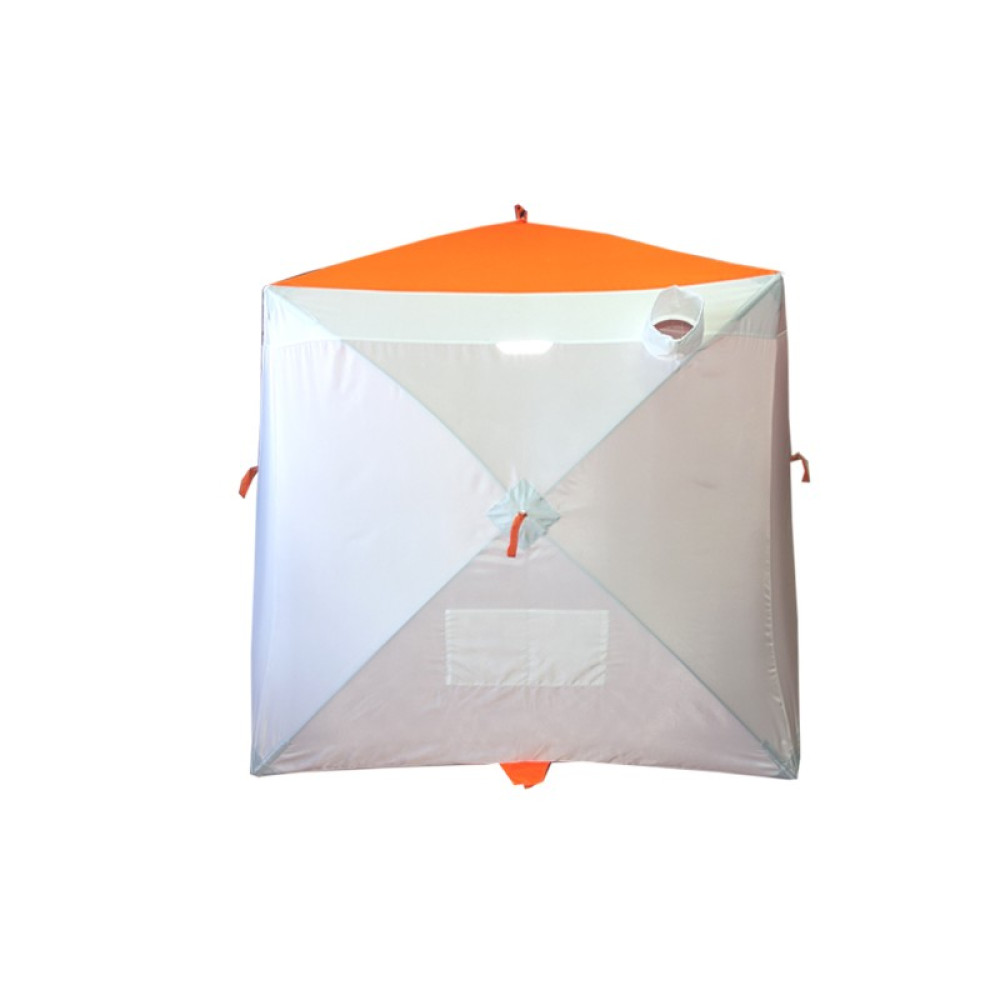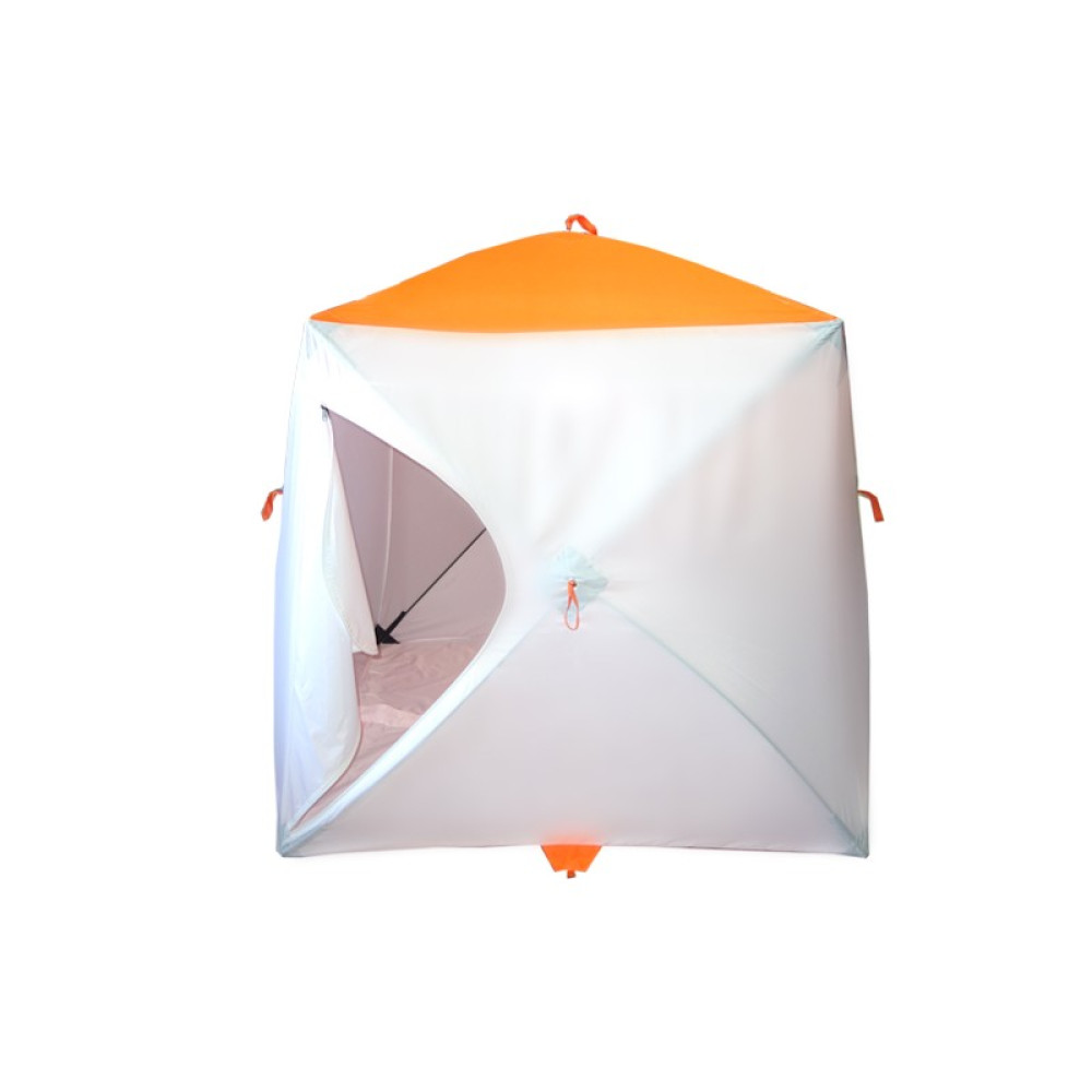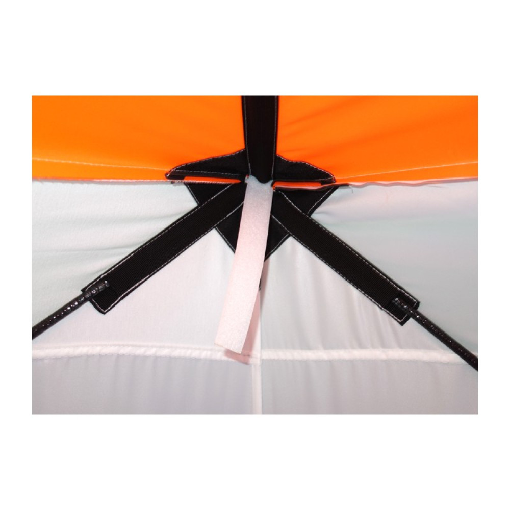 Палатка имеет форму куба, что позволяет рыбакам рационально использовать пространство. Сверлить лунки теперь можно прямо в установленной палатке. Габариты позволяют делать это без каких-либо неудобств. Благодаря своей конструкции палатка выдерживает порывистый ветер. Легко ставится в любую погоду одним человеком. В палатке могут свободно разместиться два человека и комфортно рыбачить как днем, так и ночью! Вход выполнен в угловом варианте и снабжен застежкой - липучкой, как на наружном, так и внутреннем тенте. Так же вход снабжен специальной зимней молнией, которая снаружи имеет защитную планку, предотвращающую от замерзания. Палатка выполнена в светлых тонах и имеет яркую крышу и пороги, а так же светоотражающие элементы по периметру, что позволяет увидеть палатку в ночное время. На наружной юбке имеются оттяжки для крепления порогов при отсутствии снега.