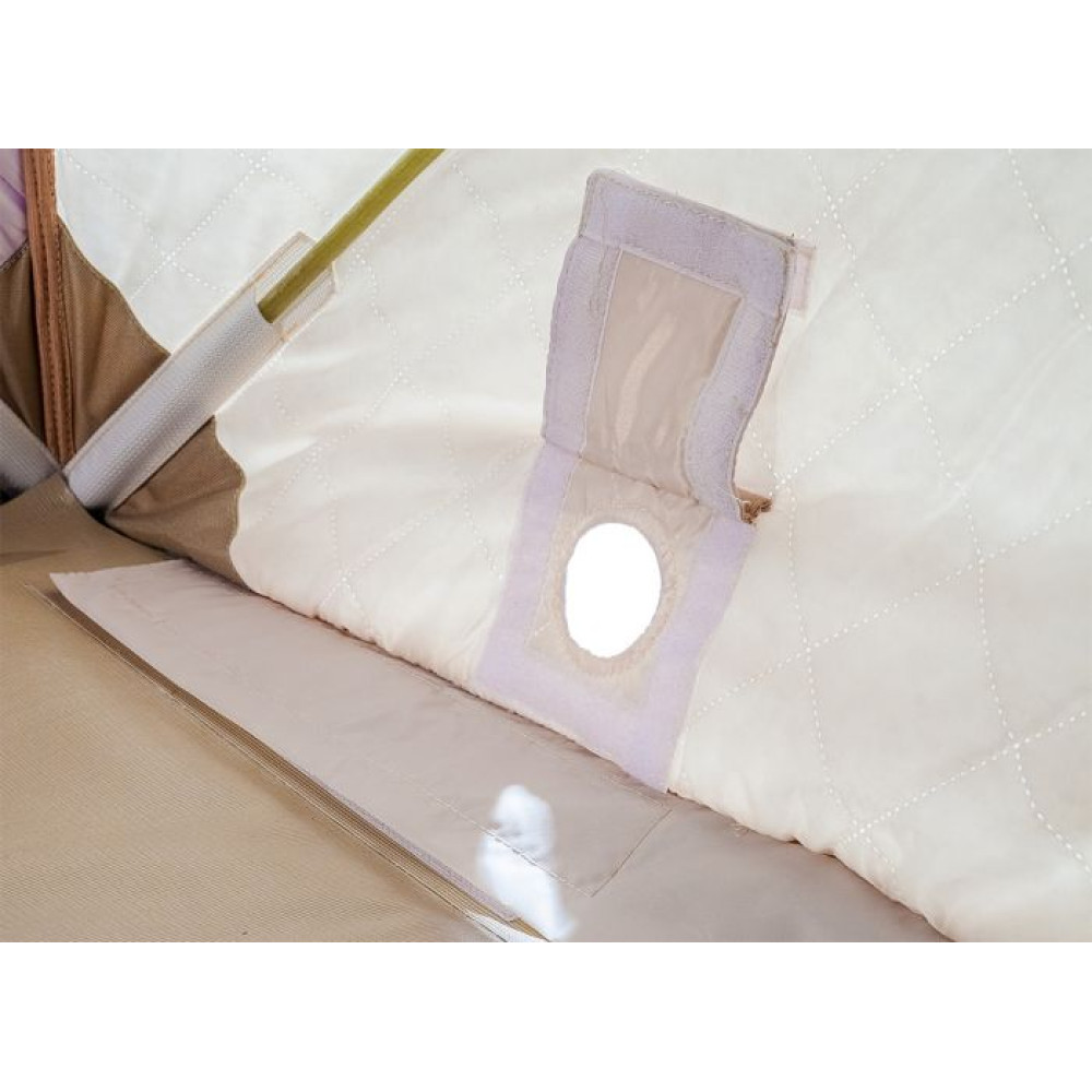 В качестве утеплителя используется синтепон, плотность материала — 150 г/м2. Тепло внутри сохраняется несколько часов. Термостежка имеет крупные ячейки, благодаря чему утеплитель не сдавливается.