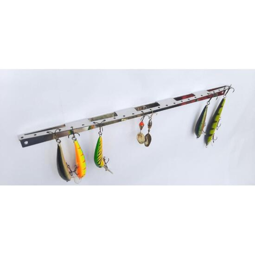 Материал: нержавеющая сталь толщиной 1,5 мм Габариты: длина 350 мм, полочка 20 мм, отверстий D3 мм под воблеры - 25 В комплект включены 3 нержавеющих шурупа 3,2 Х 16 мм