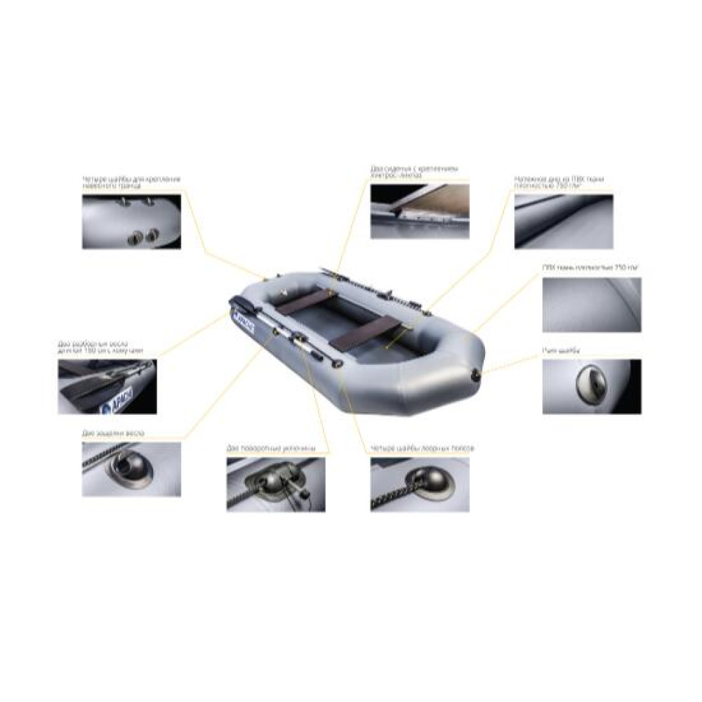 - 1.Максимальная мощность мотора2.5 л.с.Грузоподъемность220 кгПассажировместимость2Плотность ПВХ-ткани750 г/м2Тип лодкимоторно-гребнаяЦветсерыйШирина1.3 м