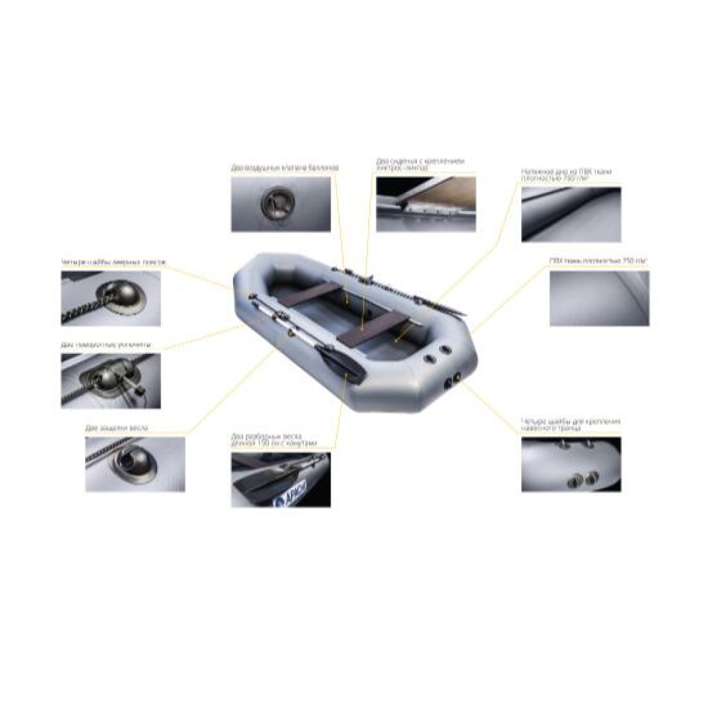 | Количество пассажиров2 | Максимальная мощность мотора (Л.С.)2.5 | Масса в комплекте15 |