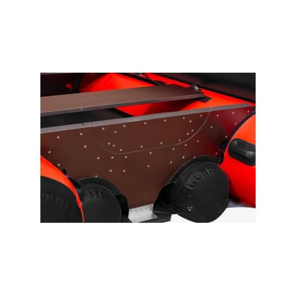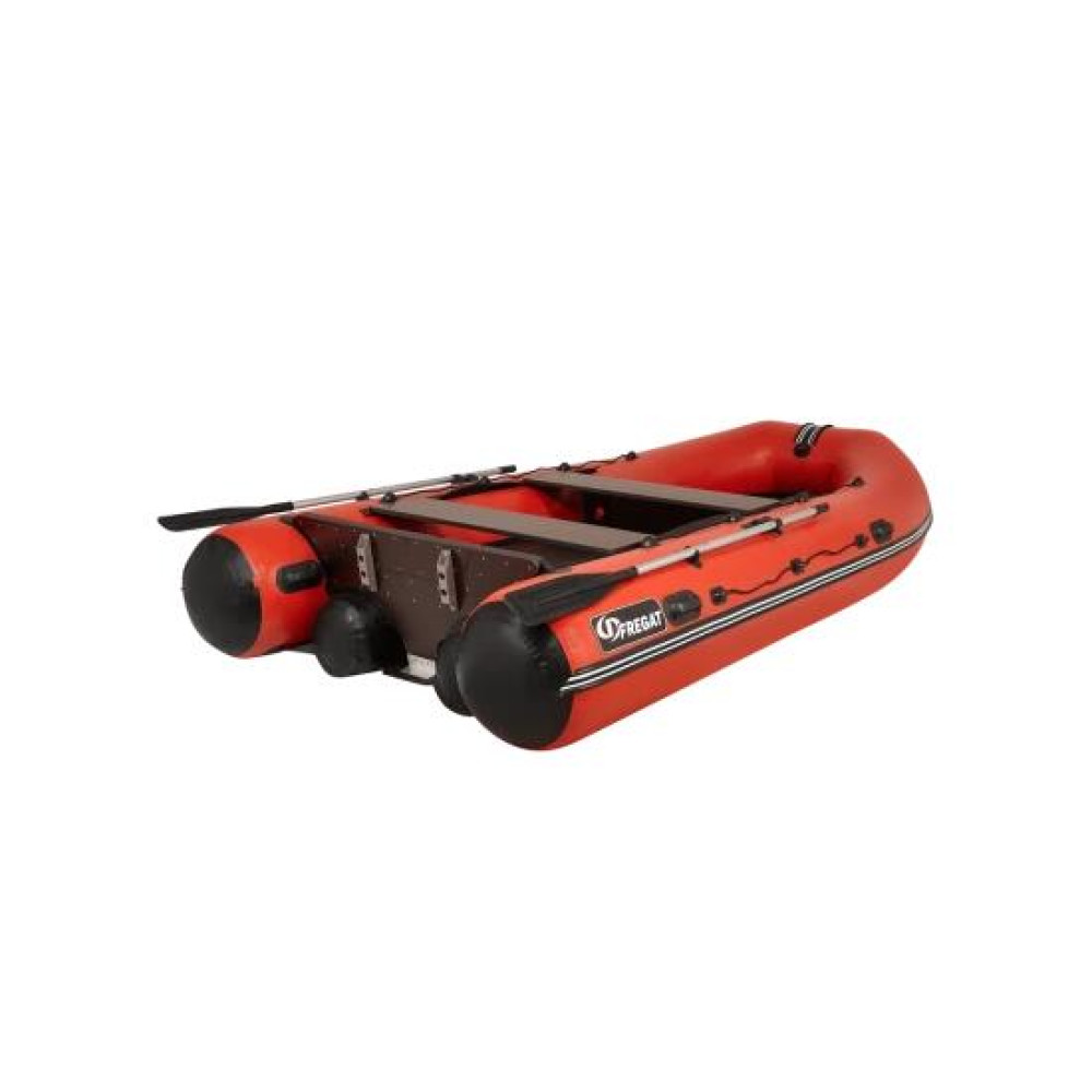 Фрегат 390 F — это пайольная моторная лодка ПВХ с надувным килем, фальшбортом, длиной 3,90 м, рассчитанная на 6 пассажиров, под мотор до 30 л. с. Складной пайол усилен стрингерами. Эта лодка компактна в упаковке и, в тоже время, имеет высокие грузоподъемность и вместимость. Модели серии Фрегат F (классические фальшбортные лодки) — созданы на базе корпусов лучших классических моделей, дополнительно оснащенных фальшбортом. Фрегат F — надежные и прочные, с отличной маневренностью и управляемостью. Они предназначены для эксплуатации на воде на значительном удалении от берега — в крупных заливах, озерах и реках. Моторные фальшбортные надувные лодки Фрегат — это особый класс лодок, оригинальная разработка компании «Фрегат». Фальшборт был впервые применен при разработке лодок для МЧС России в 1999 г. Надувная лодка Фрегат 390 F может использоваться для длительных автономных переходов и привлекательна не только для рыбаков и охотников, но и для любителей активного спорта и отдыха на воде. Важно! Моторные лодки Фрегат не требуют регистрации в ГИМС при условии эксплуатации с мотором до 10,88 л.с. При мощности мотора свыше 10,88 л.с. лодки необходимо регистрировать. Особенности модели U-образный баллон с перегородками и вклеенным транцем Лодка состоит из «U»-образного баллона, разделенного на независимые отсеки внутренними перегородками и замкнутого в корме вклеенным жестким транцем. Снизу к корпусу лодки приклеено днище с надувным килем, а к основному баллону приклеен фальшборт. Все баллоны лодки разделены герметичными перегородками, что обеспечивает непотопляемость лодки и возможность добраться до берега в случае повреждения других отсеков. По бортам расположен леерный пояс, обеспечивающий страховку пассажиров. Фальшборт Фальшборт состоит из двух дополнительных независимых одноотсековых баллонов и крепится сверху на корпус лодки. Он придает конструкции лодки целый ряд преимуществ: увеличивает высоту надводного борта лодки, продольную жесткость корпуса, объем кокпита и добавляет еще 2 независимых отсека. В результате возрастает безопасность, вместительность и грузоподъемность лодки. Окончания баллонов и кокпит Окончания баллонов имеют специальную сферическую форму. Такая форма обеспечивает быстрый выход лодки на глиссирование. Также форма баллонов позволила увеличить пространство кокпита за счет передвижения транца к окончанию баллонов. Таким образом, вместимость кокпита у лодок со сферическим окончанием баллонов больше, чем у лодок аналогичной длины с конусообразным окончанием баллонов. Размер кокпита позволяет разместить на борту больше снаряжения и припасов. Надувной киль Килевые обводы корпуса обеспечивает надувной киль, приклеенный к днищу лодки. Фрегат 390 F имеет максимальный в этом классе лодок угол килеватости днища и нижней кромки транца, что и обеспечивает этой моторной лодке великолепную управляемость и устойчивость на курсе. 390 F буквально «идет над волной» с минимальным количеством брызг и без жестких ударов о волны. Транец Жестко вклеенный под углом транец из морской фанеры. Транец в форме «крыла чайки» улучшает управляемость моторной лодки и минимизирует возможность прохвата воздуха к винту даже при резких маневрах, а также позволяет эксплуатировать лодку с более тяжелыми 4-тактными моторами.Косынки-брызгоо