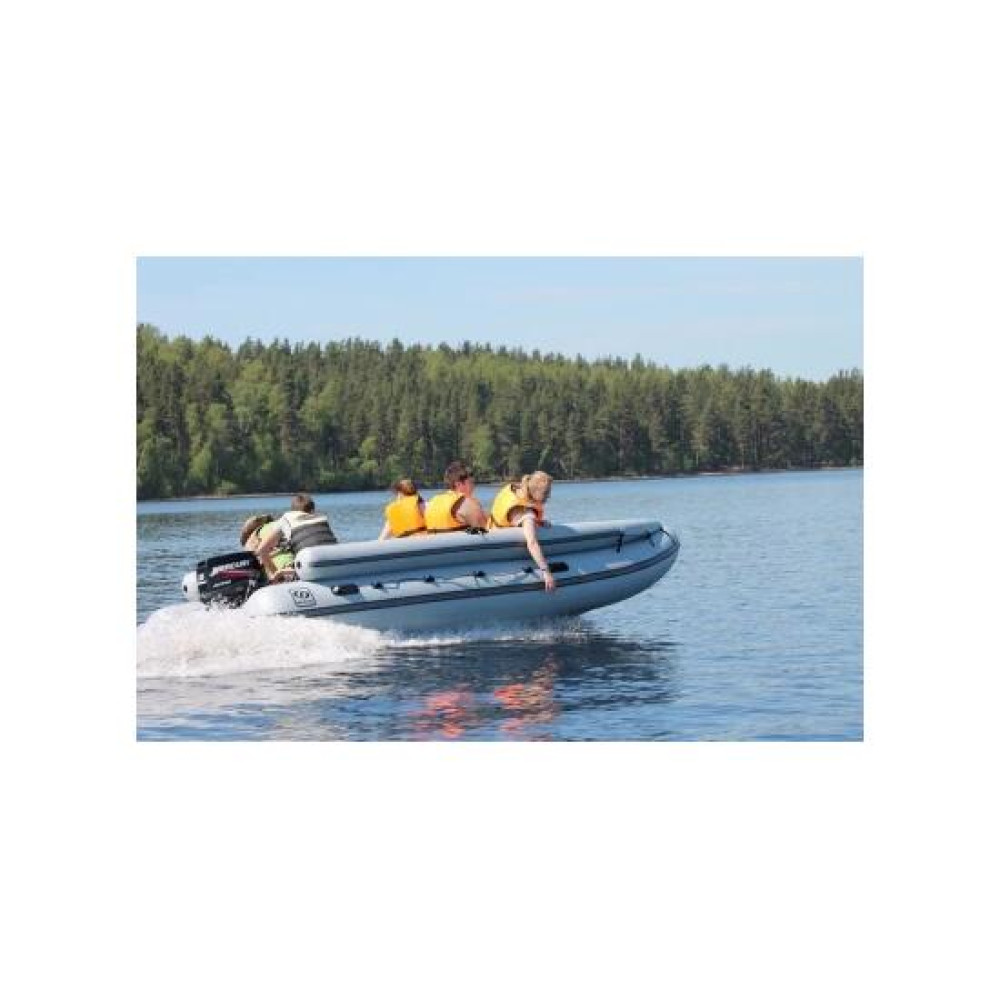Надувная лодка ПВХ Фрегат 480 FM Jet — это лодка длиной 4,82 м под водометный движитель с тоннелем, рассчитанная на 9 пассажиров. Это беспайольная лодка с надувным днищем низкого давления и фальшбортом. Нос этой модели сверху закрыт откидывающимся фартуком. Высокая надежность модели обеспечивается 9-ю независимыми баллонами. Лодки Фрегат FM Jet спроектированы для сложных условий мелководья и завалов, имеют дополнительные элементы защиты. Надежные и легко управляемые лодки FM Jet предназначены как для охоты, рыбалки, активного отдыха, так и для туризма, научных экспедиций и экстремальных путешествий на внутренних акваториях. В надувных лодках Фрегат FM Jet отсутствует пайол из фанеры, что снижает вес собранной лодки. Жесткости многобаллонного надувного днища низкого давления достаточно, чтобы комфортно чувствовать себя, ловить или стрелять с лодки стоя без пайола. Важно! Моторные лодки Фрегат не требуют регистрации в ГИМС при условии эксплуатации с мотором до 10,88 л.с. При установке на Фрегат 480 FM Jet мотора мощностью от 10, 89 до 50 л.с. регистрация в ГИМС необходима. Фрегат FM — уникальная разработка Лодки с надувным многобаллонным дном низкого давления серии FM — особый класс лодок, оригинальная разработка компании «Фрегат», не имеющая аналогов. Лодки Фрегат FM-класса были специально разработаны в 1999 году по заказу спасательной службы МЧС России. Лодки Фрегат класса FM — на вооружении самолета-амфибии БЕ-200 ЧС. Именно на надувных лодках Фрегат FM-класса, в рамках организованной РГО и РОССОЮЗСПАСом летом 2016 года экспедиции «Полюс холода соединяет океаны», участники экспедиции впервые в мире пересекли континент Евразия от Тихого до Северного Ледовитого океана, пройдя 2800 км. Особенности модели Фрегат 480 FM Jet Надувная лодка ПВХ 480 FM Jet состоит из подковообразного баллона, разделенного на 4 независимых отсека, с приклеенным к нему фальшбортом, состоящим из двух независимых одноотсековых баллонов. Нос сверху закрыт откидывающимся фартуком. В корме корпуса установлен транец, служащий для крепления подвесного мотора. Дно надувной лодки Фрегат образуют 3 продольных баллона, приклеенных к самоотливной палубе, находящейся при полной загрузке лодки выше уровня воды. На корме и носу надувной лодки ПВХ установлены ручки, служащие для ее переноски в рабочем состоянии. Внутри кокпита и снаружи корпуса установлены леерные пояса, обеспечивающие страховку пассажирам. Надувное днище низкого давления НДНД Про Общее для всех лодок класса FM — днище низкого давления из 3-х независимых продольных баллонов низкого давления, соединенных между собой. Такая конструкция дает продольную жесткость корпуса и поперечную жесткость днища (сопоставимую с жесткокорпусными судами) и, как следствие, высокие скоростные характеристики. Дополнительная поперечная жесткость лодки обеспечивается шпангоутом, вклеенным в корпус в районе миделя. Он разделяет кокпит на уровне палубы на 2 независимые зоны, ограничивая возможность незапланированного смещения груза и изменения продольной центровки при движении лодки. Также благодаря днищу низкого давления у лодки Фрегат 480 FM Jet самоосушаемая палуба. Конструкция днища низкого давления обеспечивает лодке высокие скоростные характеристики, маневренность, устойчивость на курсе, надежность в условиях экстремальной ситуации. Особеннос