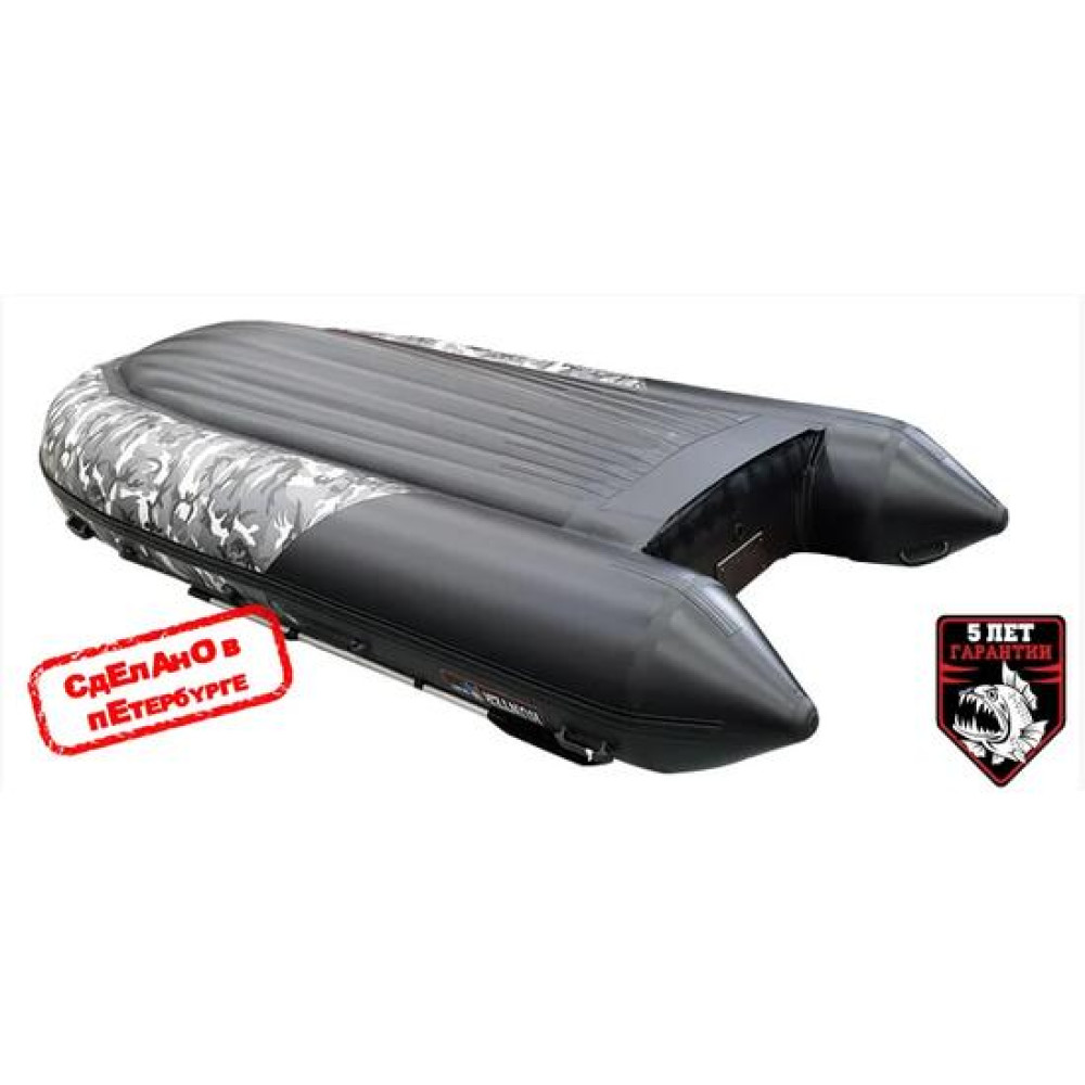 Надувная лодка Хантер 380 ПРО со стационарным вклеенным умеренно-килевым дном низкого давления (НДНД) рассчитана на использование с мотором до 25 л.с