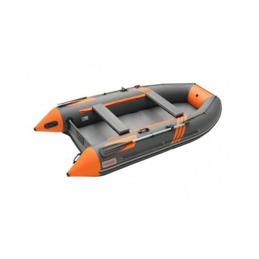 Данная модель комплектуется разборными веслами с пластиковой фурнитурой и поворотными уключинами.Баллон разделен воздухонепроницаемыми перегородками на три независимых отсека + надувной пол таким образом, чтобы в случае выхода из строя одного из отсеков моторно-гребная лодка сохраняла положение равновесия.Передвижные банки (сиденья), которые крепятся к бокам лодки системой "ликтрос-ликпаз", позволяют сидящему в лодке выбрать наиболее удобное положение