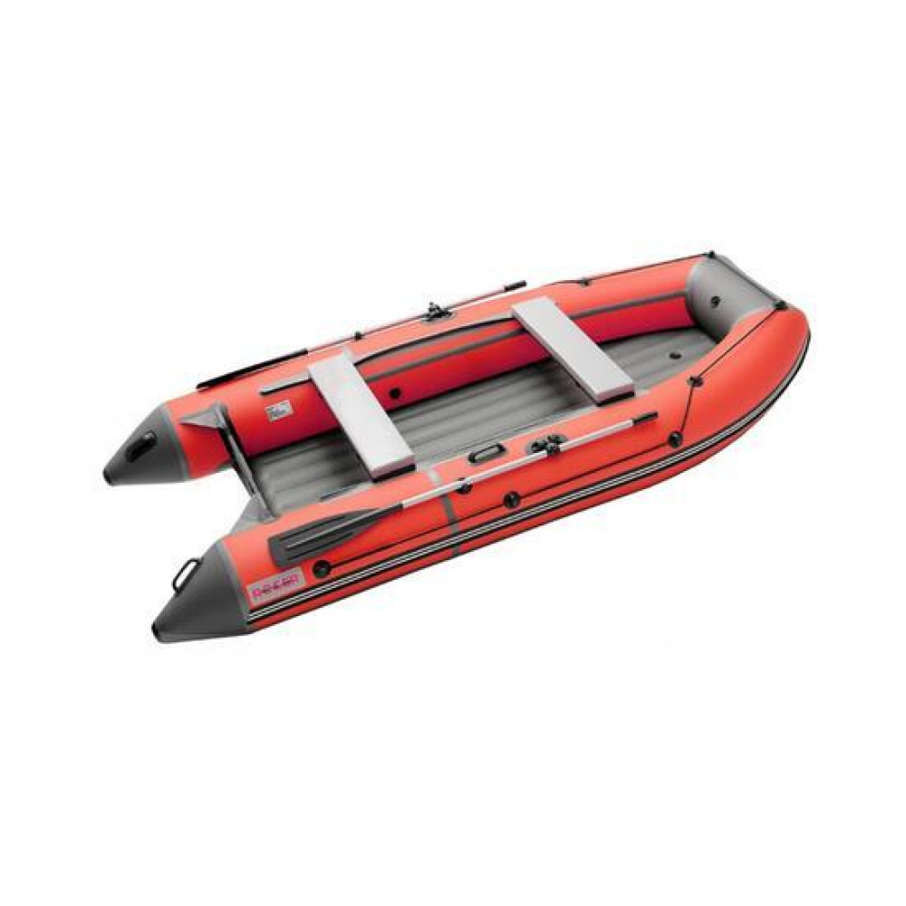Данная модель комплектуется разборными веслами с пластиковой фурнитурой и поворотными уключинами.Баллон разделен воздухонепроницаемыми перегородками на три независимых отсека + надувной пол таким образом, чтобы в случае выхода из строя одного из отсеков моторно-гребная лодка сохраняла положение равновесия.Передвижные банки (сиденья), которые крепятся к бокам лодки системой "ликтрос-ликпаз", позволяют сидящему в лодке выбрать наиболее удобное положение